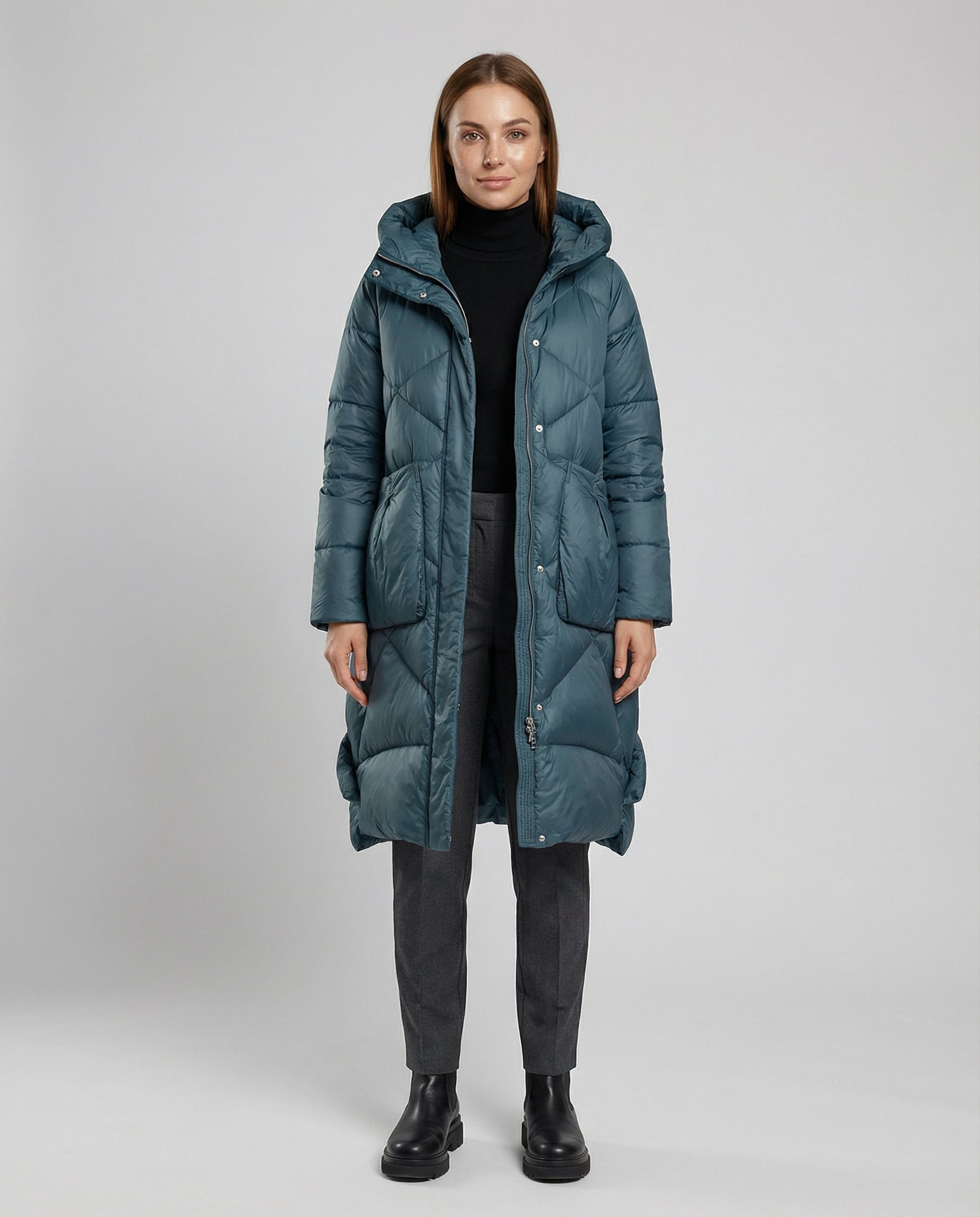 Long winter jacket in loose fit with quilted structure, hood, and full-length zipper.
